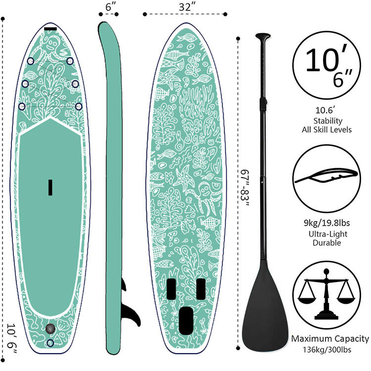 - Bahan Tahan Lama yang Ditingkatkan:Huarui SUP terbuat dari PVC berkualitas tinggi dan dibangun dengan konstruksi drop-stitch, yang memberikan stabilitas dan keamanan untuk penggunaan waktu yang lama.10'6"panjang x 32'' lebar x 6'' tebal, dengan kapasitas berat hingga 330lbs.Desain SUP ekstra lebar mudah untuk semua tingkat keahlian dengan hewan peliharaan untuk berdiri dan menjaga keseimbangan.