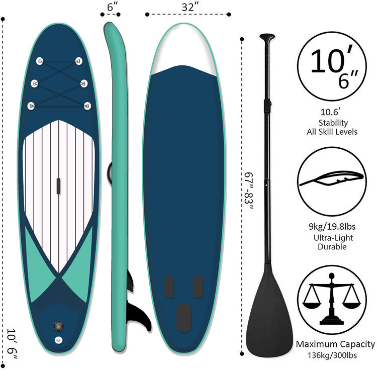 | Menyoroti | Papan Sup Papan Selancar Tiup,Papan Dayung Berdiri 10'6''x32''x6'',kekuatan tak tertandingi Papan Sup Tur |